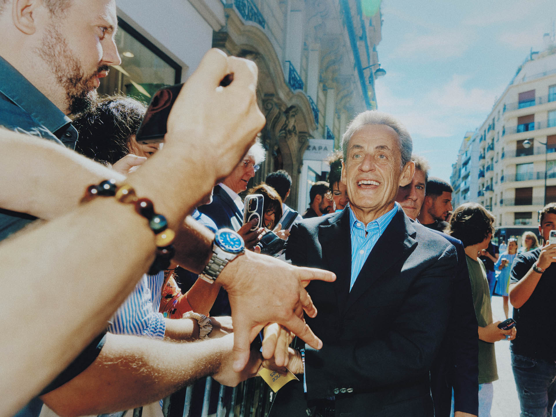 Un livre par personne, un autocollant avec son nom écrit dessus et une longue file d’attente. Il est 16h, ce vendredi 1er septembre, et la caravane de la tournée de dédicaces du nouveau livre de Nicolas Sarkozy fait étape place du Marché, à Deauville. Plusieurs centaines de personnes s’amassent, dont une mère et sa fille qui ont vu “à la télé” qu’il y avait une date dans leur ville, qu’elles ne louperaient “pour rien au monde”. Pierre, 26 ans, est venu avec son vieux t-shirt des “Jeunes avec Sarko”, qu’il porte à la main, pour le faire signer. Nicolas, 44 ans, ex-petite main des campagnes présidentielles, ancien des jeunes de l’UMP, qui a “gardé la flamme” et a lu “tous ses livres”, est arrivé parmi les premiers. Il est nostalgique des grandes heures du sarkozysme, qui correspondent à ses années de jeunesse, dit-il. Loin derrière, Rayan, 31 ans, t-shirt du PSG, est venu, lui, saluer “le fan du club parisien. C’est grâce à monsieur Sarkozy qu’on a les Qataris aujourd’hui”. La star du jour arrive à l’heure, accompagnée de sa fille, Giulia, et salue la foule en serrant des mains et disant “merci”, comme à la grande époque, suivie de la sécurité et de sa conseillère en communication, Véronique Waché. Philippe Augier, le maire de Deauville, est là pour l’accueillir. Nicolas Sarkozy, en parlant de sa fille: “T’as vu comment elle est belle?” Quelques questions de la presse, puis il s’assoit à sa table. À un journaliste avec un piercing qui se tient à côté: “Ça vous a pas fait mal ce que vous avez dans la lèvre?”