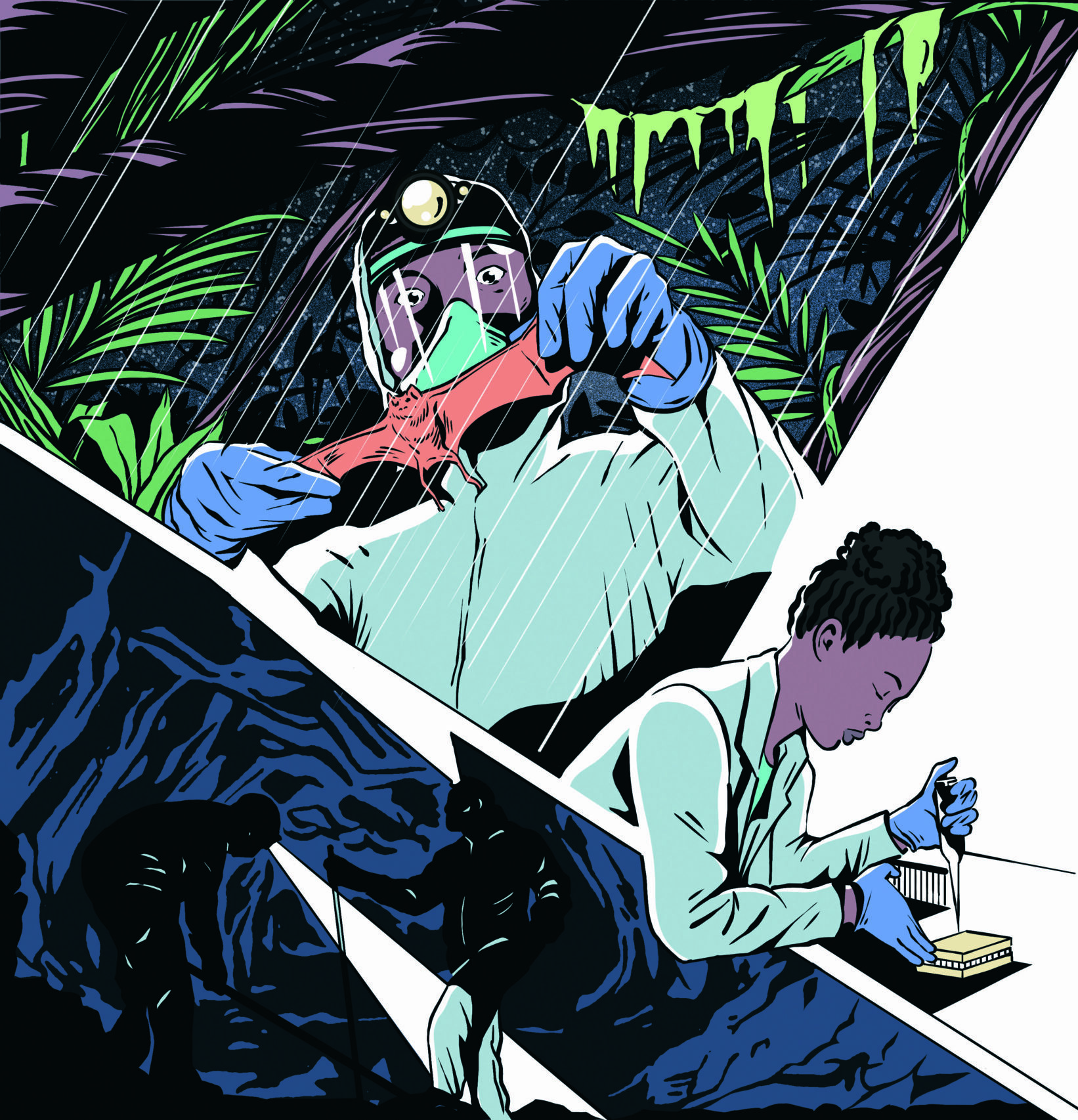 Dans l’obscurité crépusculaire, seuls les bruits des battements d’ailes trahissent leur présence. Jusqu’à ce qu’à l’affût devant l’entrée de la grotte, Simon-Pierre Kumugo lève la main pour signaler une soudaine série de minuscules glapissements aigus, suivis d’un bruit mat. Son embuscade a fonctionné: une chauve-souris s’est accrochée dans le piège à harpe qu’il a tendu quelques instants plus tôt avec son collègue Guy Uymidingi et a glissé, impuissante, jusque dans la poche en toile rattachée à la structure. Impossible pour elle de s’en échapper. Rapidement, une autre chauve-souris l’y rejoint, suivie d’une autre et, une demi-heure plus tard, une cinquantaine de spécimens ainsi capturés emplissent la nuit de leurs couinements affolés. Le piège est plein.